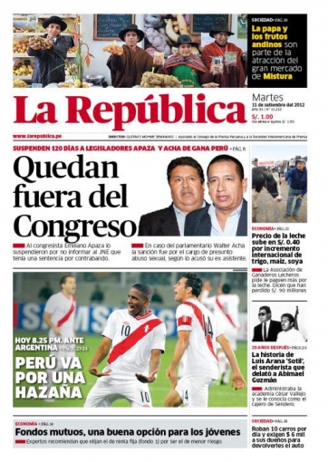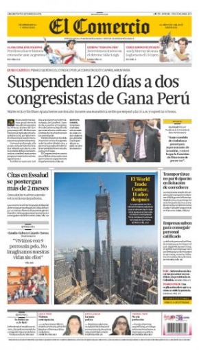 Entre los temas más destacados por la prensa escrita peruana para hoy martes 11 de setiembre, está la suspensión de los parlamentarios Walter Acha y Emiliano Apaza por faltas éticas, quienes por 120 días no podrán ejercer sus funciones en el Parlamento y sin goce de haberes.