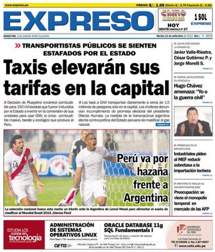 “Taxis elevarán sus tarifas en la capital”, el título abre el día en el vespertino Expreso y hace referencia a una probable alza de los precios de este tipo de transportes en Lima, debido a un supuesto incremento del valor del Gas Natural Vehicular (GNV).