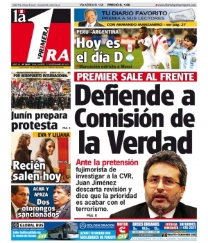 Por su parte, el periódico La Primera cede interés al primer ministro Juan Jiménez. El funcionario defendió el informe final de la Comisión de la Verdad y Reconciliación (CVR), respondiendo así la propuesta de la parlamentaria fujimorista Luz Salgado de revisarlo.