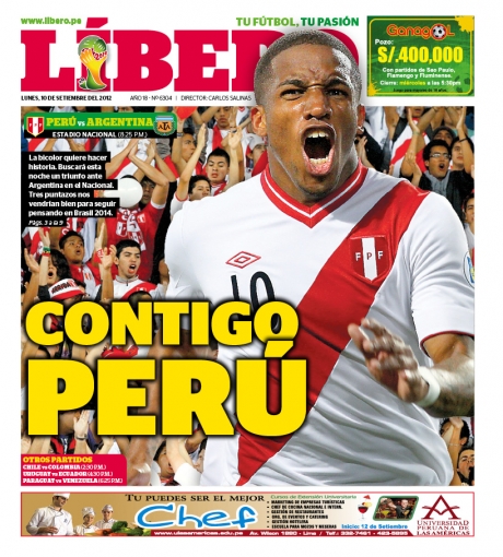 De esta manera, el diario Líbero tituló: 'Contigo Perú', en referencia al complicado choque entre la 'blanquirroja' y la 'albiceleste' en el que los locales intentarán dar la sorpresa que les permita seguir luchando por un cupo a la justa mundialista.