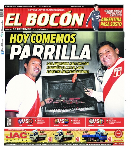 El Bocón tituló en su carátula: 'Hoy comemos parrilla', refiriéndose al duelo ante los gauchos en el coloso de José Díaz en el que 'el equipo de todos' deberá demostrar su localía y sumar para seguir con el objetivo de clasificar al Mundial Brasil 2014.