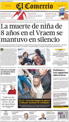 Entre los temas más destacados por la prensa escrita peruana para hoy jueves 13 de setiembre, está el fallecimiento de una menor de edad durante un operativo de rescate en el Valle de los Ríos Apurímac, Ene y Mantaro (VRAEM).