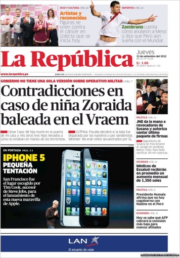 Por su parte, los temas tecnológicos ganaron la primera hoja del periódico La República. Uno de los más conocidos representantes de Apple, Phil Schiller, presentó el esperado iPhone 5, la nueva versión de su teléfono inteligente, que ahora tiene un grosor de 7.6 milímetros y una pantalla Retina Display de cuatro pulgadas con capacidad para 326 PPI, con resolución de de 1136x640 píxeles.