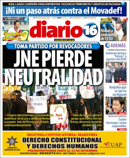 “JNE pierde neutralidad”. De acuerdo a Diario 16, el seno del Jurado Nacional de Elecciones (JNE) decidió extender el proceso de verificación del cuarto lote de rúbricas a la Reniec, presentado por los promotores de la campaña de revocatoria contra la burgomaestre de Lima, Susana Villarán, y de sus 39 regidores.