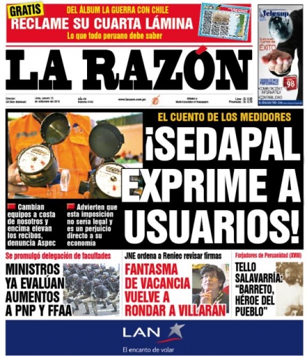 Finalizamos este recorrido con el vespertino La Razón, que hace hincapié en unas supuestas irregularidades en las estaría involucrada la entidad estatal, relativas a los medidores y a supuestos aumentos en los recibos mensuales.