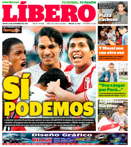 De esta manera, el diario Líbero tituló: 'SÍ podemos', en referencia a los próximos partidos que se le vienen a la selección peruana ante Bolivia en La Paz (12 de octubre) y ante Paraguay en Asunción (16 de octubre).