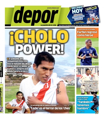 Por otro lado, el diario Depor tituló 'Cholo power', en alusión al goleador del torneo Andy Pando, quien ya lleva anotados 14 goles con el Real Garcilaso y espera ser convocado por el técnico Sergio Markarián para el duelo ante Bolivia en la Paz.