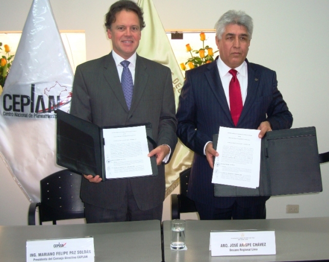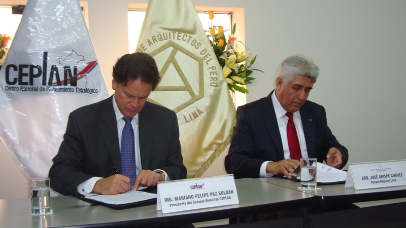 El Centro Nacional de Planeamiento Estratégico (CEPLAN) y el Colegio de Arquitectos del Perú firmaron un convenio marco de colaboración interinstitucional que tiene por objeto establecer un mecanismo de cooperación entre el Colegio de Arquitectos – Regional Lima y el Sistema Nacional de Planeamiento Estratégico (SINAPLAN), en materia de planeamiento estratégico y temas estratégicos prioritarios de gestión de Estado, que coadyuve al cumplimiento de los objetivos institucionales de ambas entidades.