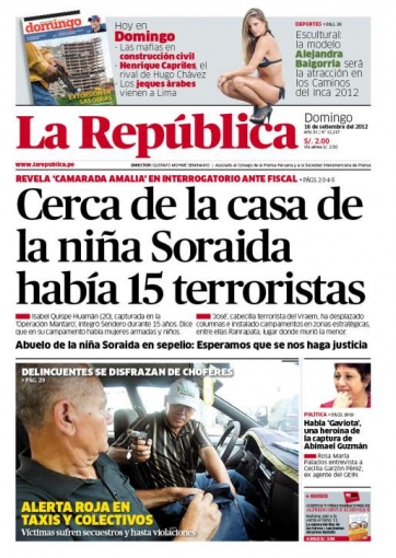 Por su parte, el periódico La República exhibe en su presentación más información del caso de la niña Soraida Caso, quien murió durante un operativo de rescate en el Vraem. Según lo dicho por parte de la capturada Isabel Quispe Huamán “Camarada Amalia” durante un interrogatorio ante el fiscal correspondiente, habían por lo menos 15 terroristas armados cerca de la casa de la menor, además de un destacamento femenino y 10 niños más.
