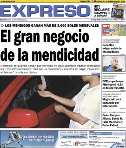 “El gran negocio de la mendicidad”. Siguiendo un informe del vespertino Expreso, un limosnero tiene 30 segundos para intentar recibir un mínimo de 50 céntimos, lo que en una hora le permitiría percibir no menos de 30 soles, teniendo en cuenta que en promedio cada 30 segundos un semáforo cambia de estado (30 en rojo y otro mismo tiempo para verde).