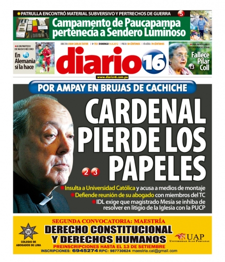 Cerramos este recorrido con Diario 16, que cede importancia al Arzobispo de Lima Juan Luis Cipriani y su punto de vista respecto a la reunión que sostuvo el abogado del Arzobispado, Natale Amprimo, en el restaurante Brujas de Cachiche con tres integrantes del Tribunal Constitucional (TC).