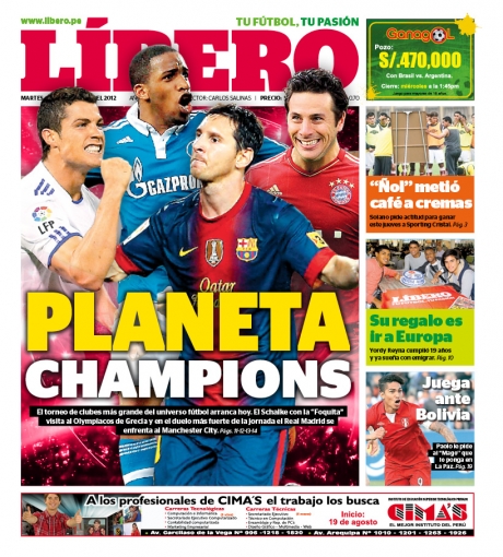 De esta manera, el diario Líbero tituló: 'Planeta Champions', en referencia a esta primera fecha del torneo de clubes más importante del mundo que también tiene a los peruanos Jefferson Farfán y Claudio Pizarro en el Schalke 04 y Bayern Múnich, respectivamente.