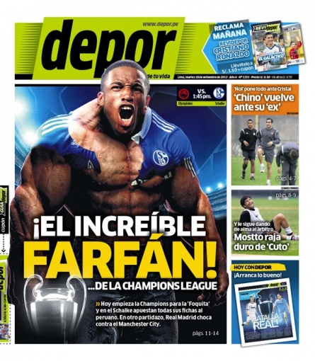 Por su parte, el diario Depor destaca en su portada la figura de un 'Increíble Jefferson Farfán' que debutará hoy en el torneo de campeones de Europa, mientras que en otros temas, el 'Chino' Ximénez volverá al titularato en la 'U' nada menos que ante su ex equipo, Sporting Cristal.