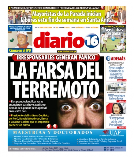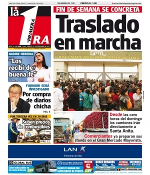 Finalizamos este recorrido con La Primera, que ofrece un informe respecto al inicio de la etapa de traslado de los comerciantes de La Parada (La Victoria) a las instalaciones del Mercado Mayorista de Santa Anita; mientras que Diario 16 sobre el supuesto terremoto que ocurriría en Lima el día de hoy, pronosticado por las científicas rusas Victoria Popova y Lidia Andrianova.