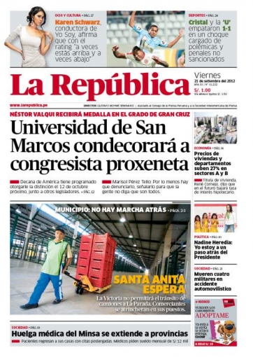 Por su parte, el vespertino La República exhibe en su presentación el próximo reconocimiento que recibirá el legislador Néstor Valqui por parte de la Universidad Nacional Mayor de San Marco (UNMSM), quien recibirá la "Medalla de Honor Sanmarquina en el Grado de Gran Cruz".