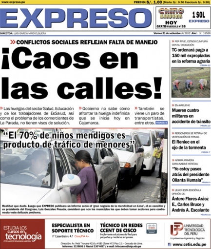 Las manifestaciones de un grupo de médicos y maestros en la capital ganaron la cara del periódico Expreso. El medio hace hincapié a las protestas que un nutrido grupo de educadores perteneciente al Sindicato Unitario de Trabajadores en la Educación del Perú (Sutep) viene realizando en el corazón de la ciudad y frente a la sede del Ministerio de Educación (Minedu), exigiendo un aumento de sueldo, la derogación de la Ley de Carrera Pública Magisterial y la no promulgación de la llamada Ley de Reforma Magisterial, que pretende aplicar justamente el Minedu presidido por Patricia Salas.