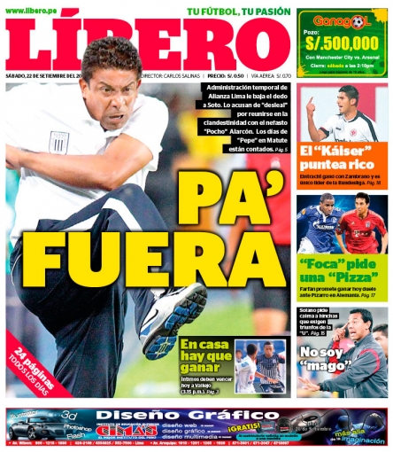 Los principales diarios deportivos del país informan en sus portadas de hoy sábado 22 de setiembre sobre la posibilidad que el técnico José Soto deje Alianza Lima ya que no cuenta con el apoyo de la administración temporal del cuadro íntimo luego de haberse reunido en la clandestinidad con el ex presidente aliancista, Guillermo Alarcón.