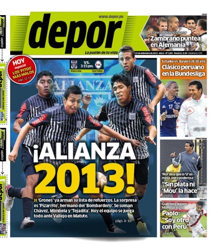 Culminando este recorrido, el diario Depor titula en su carátula de hoy: 'Alianza 2013', en referencia a las próximas contrataciones del cuadro blanquiazul para la siguiente temporada entre los que destacan el hermano de Claudio Pizarro, Diego Pizarro, Daniel Chávez, William Mimbela y Manuel Tejada.