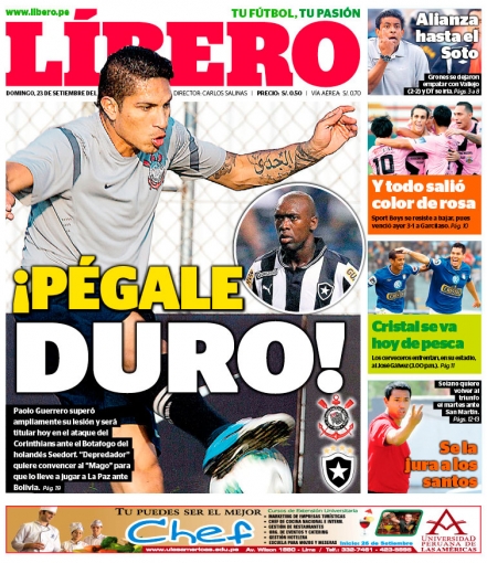 Por su parte, el diario Líbero muestra en su presentación a Paolo Guerrero y a su posibilidad de reaparecer hoy en el Campeonato Brasilero bajo las sedas del Corinthians.