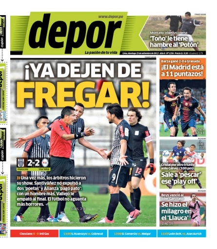 Los principales diarios deportivos del país informan en sus portadas de hoy domingo 23 de setiembre, sobre el empate que logró Alianza Lima ante César Vallejo por 2 a 2 en el estadio Alejandro Villanueva.