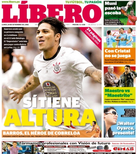De esta manera, el diario Líbero tituló: 'Sí tiene altura', en referencia al gol anotado por el 'Depredador' con su nuevo club por lo que ya se encuentra listo para enfrentar a Bolivia el 12 de octubre en La Paz por la novena fecha de las Eliminatorias Brasil 2014.