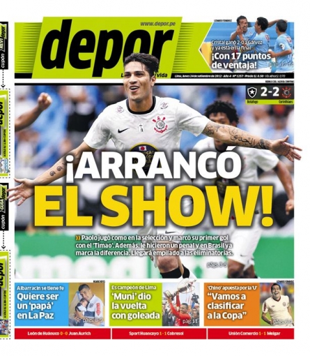 Por su parte, el diario Depor titula: '¡Arrancó el show!', en alusión a la buena jornada de Paolo Guerrero en el empate del Corinthians anotando un gol que lo hace tomar más confianza para llegar de la mejor manera para el choque ante los altiplánicos.