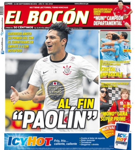Culminando este recorrido, El Bocón también informa sobre el primer gol de Guerrero en Brasil titulando: 'Al fin Paolín'. El peruano jugó un gran encuentro generando un penal para el Corinthians que igualó como visitante ante el Botafogo del holandés Clarence Seedorf, quien también anotó un gol.
