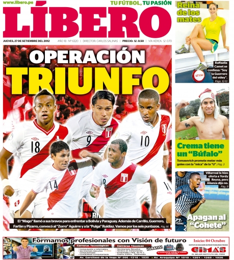 De esta manera, el diario Líbero tituló: 'Operación triunfo', en referencia a dicho llamado en el que el delantero del San Luis de México, Wilmer Aguirre y el artillero del Coritiba de Brasil, Raúl Ruidíaz son las novedades.