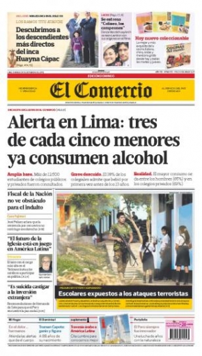 Cerramos este recorrido con el decano de la prensa local, El Comercio, que ofrece en su primera hoja un estudio sobre el consumo de bebidas alcohólicas en Lima, donde revela por ejemplo que 3 de cada 5 menores de edad ya ingieren alcohol.