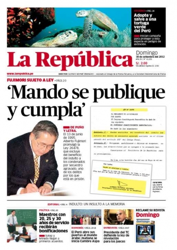 Bajo esa misma línea aparece el periódico La República. El perdón presidencial para el máximo representante del fujimorismo le sería denegado, ya que su propio régimen promulgó una norma que se lo impide.