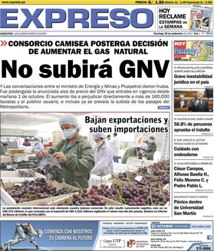 Por su parte, el vespertino Expreso pone su interés en el valor del Gas Natural Vehicular (GNV). El Ministerio de Energía y Minas ya habría llegado a un acuerdo con la empresa argentina Pluspetrol, que preside las extracciones de los yacimientos de Camisea, para retrasar el alza del combustible hasta diciembre próximo.