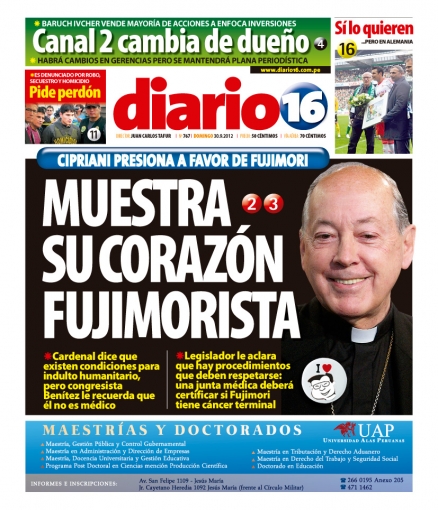 Entre los temas más destacados por la prensa escrita peruana para hoy domingo 30 de setiembre, están las expresiones del Arzobispo de Lima Juan Luis Cipriani sobre el supuesto delicado estado de salud del expresidente Alberto Fujimori, por lo que está de acuerdo en extenderle el indulto humanitario.