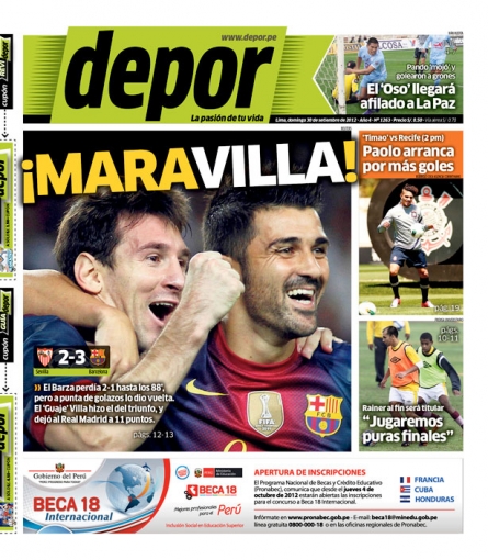 Los principales diarios deportivos del país informan en sus portadas de hoy domingo 30 de setiembre, sobre el triunfo que logró el FC Barcelona de visita ante el Sevilla, por una fecha más del Campeonato Español de Fútbol.