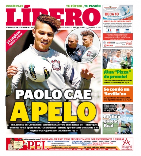 Por su parte, el diario Líbero muestra en su presentación al delantero Paolo Guerrero. El popular “Depredador” será hoy de la partida cuando su equipo Corinthians enfrente al Sport Recife en el estadio “Pacaembú” de Sao Paulo.