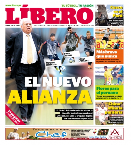Los principales diarios deportivos del país informan en sus portadas de hoy lunes 1 de octubre, sobre la posibilidad de que el uruguayo Aníbal Ruiz se convierta en el nuevo entrenador de Alianza Lima para el año 2013.