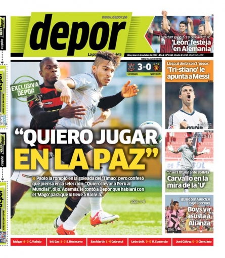 Por su parte, la gaceta Depor presenta en su rostro el pedido especial del delantero Paolo Guerrero. El popular “Depredador” expresó su deseo de estar presente en el encuentro que la selección peruana sostendrá en la altura de La Paz ante Bolivia, por las Eliminatorias 2014.