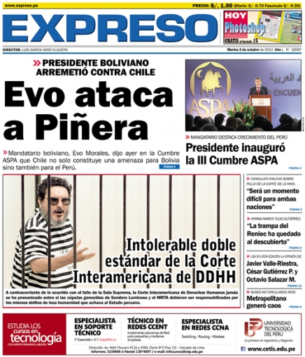 De otro lado, los temas internacionales aparecen en la primera hoja del vespertino Expreso. El jefe de Estado boliviano, Evo Morales, advirtió que Chile “es un peligro para la región”, en alusión a la negativa de esta última de dar luz verde al pedido de su Gobierno para tener acceso al mar.