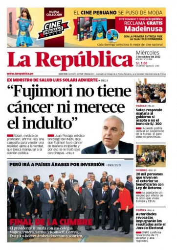 Entre los temas más destacados por la prensa escrita peruana para hoy miércoles 3 de octubre, está la opinión del extitular del Consejo de Ministros Luis Solari respecto a la posibilidad del indulto para el exmandatario Alberto Fujimori, por estar supuestamente delicado de salud.