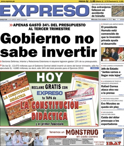 Por su parte, el diario Expreso se ocupa de los temas relacionados al gasto público. El congresista Juan Carlos Eguren reveló que el Gobierno central solo ha utilizado 4 mil 680 millones de nuevos soles al cierre del tercer trimestre del año, lo que representa un 34% del total, dejando para otras inversiones un monto de 8 mil 790 millones de nuevos soles.