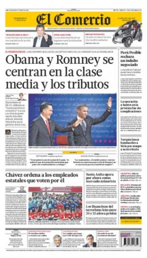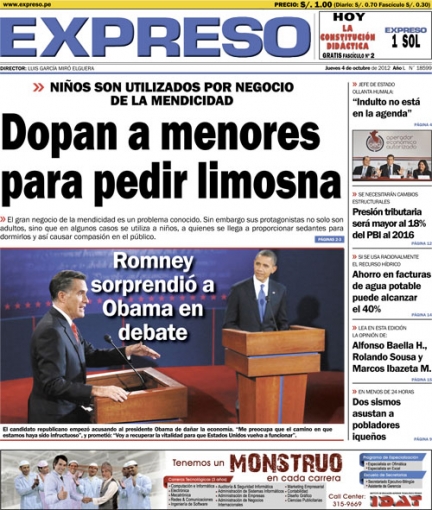 Entre los temas más destacados por la prensa escrita peruana para hoy jueves 4 de octubre, está el encuentro que sostuvieron el actual mandatario y representante demócrata Barack Obama y el aspirante republicano Mitt Romney, en el primer debate televisivo de cara a las elecciones de noviembre próximo en Estados Unidos.
