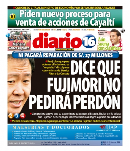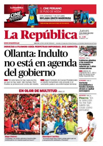 Por otro lado, el periódico La República se ocupa del probable indulto al exmandatario Alberto Fujimori. El jefe de Estado Ollanta Humala señaló que en la agenda de su administración no figura la posibilidad de conceder el perdón humanitario al primero, quien presuntamente está delicado de salud.