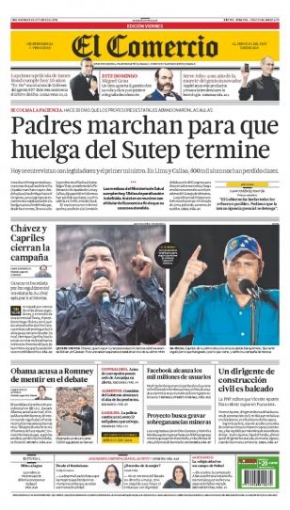 Entre los temas más destacados por la prensa escrita peruana para hoy viernes 5 de octubre, está el pedido de las Asociaciones de Padres de Familia (APAFA) y los consejos Educativos Institucionales (CONEIS), de suspender la huelga indefinida de maestros encabezada por el Sindicato Unitario de Trabajadores en la Educación del Perú (Sutep) que lleva más de un mes, además del reinicio de las clases en todos los colegios correspondientes.