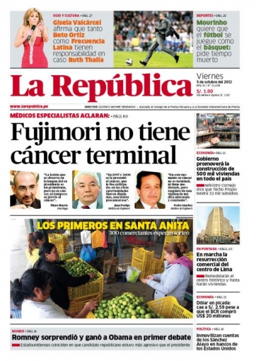 Por su parte, el vespertino La República cede interés al estado de salud del exmandatario Alberto Fujimori. El oncólogo y científico Elmer Huerta aclaró que el político padece de un granuloma, que consiste en un tipo de bulto que normalmente aparece cuando se opera en zonas húmedas.