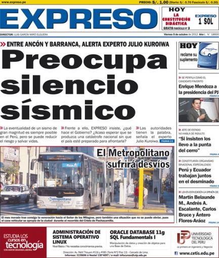 “Preocupa silencio sísmico”. El titular inicia el día en el periódico Expreso y se refiere a la posibilidad de un movimiento telúrico en la costa peruana. Uno de los más conocidos expertos en el tema, Julio Kuroiwa, en las cercanías de Lima existiría una gran cantidad de energía acumulada que, de acuerdo a la teoría del silencio sísmico, generaría un sismo de gran magnitud en la ciudad.