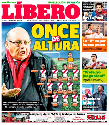 La noticia aparece en el rostro de la gaceta Líbero. El estratega de la “bicolor” Sergio Markarián confía en traerse de La Paz los puntos necesarios para el objetivo principal, que es clasificar al certamen mundial.