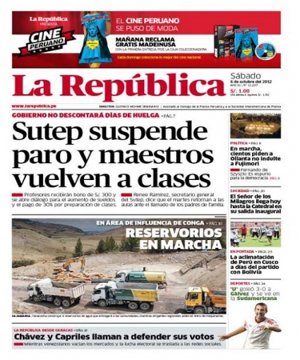 Entre los temas más destacados por la prensa escrita local para hoy sábado 6 de octubre, resalta la suspensión del paro de maestros que encabezaba el Sindicato Unitario de Trabajadores en la Educación del Perú. (Sutep) a nivel nacional, que el día de ayer cumplió un mes a nivel nacional.