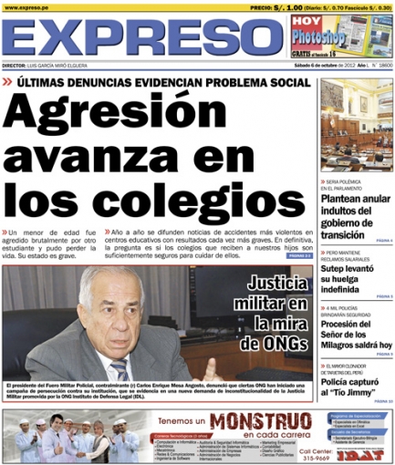 Los temas relativos al bullying se exhiben en la primera hoja del vespertino Expreso. El hijo menor del señor Daniel Vega Farías, con las iniciales P.V, será sometido a una compleja operación maxilofacial luego de ser agredido gravemente por sus compañeros del colegio particular San Francisco Javier, cuando el centro educativo celebraba sus olimpiadas el pasado sábado 29 de setiembre.