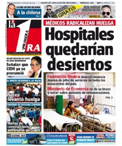 Cerramos este recorrido con La Primera. El titular Federación Médica Peruana, César Palomino, anunció la dimisión de 174 jefes de servicios y departamentos en varios hospitales a nivel nacional, advirtiendo que las renuncias continuarán en los próximos días.
