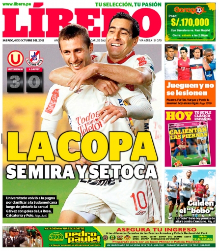 La noticia logró aparecer en la primera hoja de la gaceta Líbero. Anoche en el Estadio Monumental, Universitario de Deportes venció por 3-0 al José Gálvez. De esta manera el equipo crema se mete en la zona de clasificación a una copa internacional.
