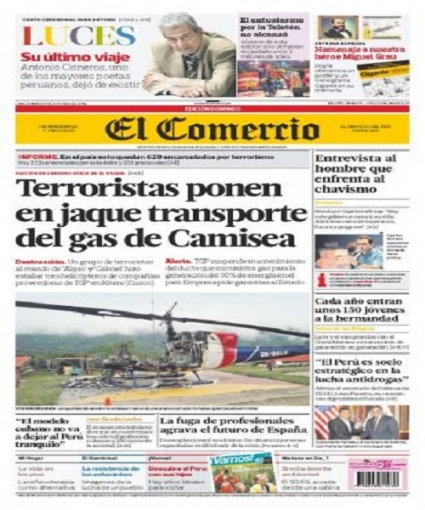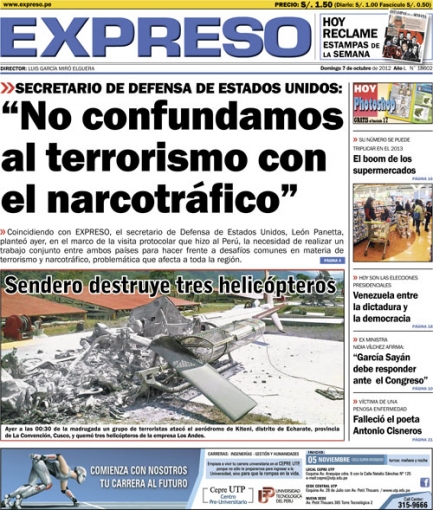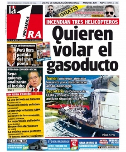 Entre los temas más destacados por la prensa escrita peruana para hoy domingo 7 de octubre, está el atentado narcoterrorista que voló tres helicópteros que ofrecían sus servicios a los operadores del gas en Camisea, en la región Cusco.